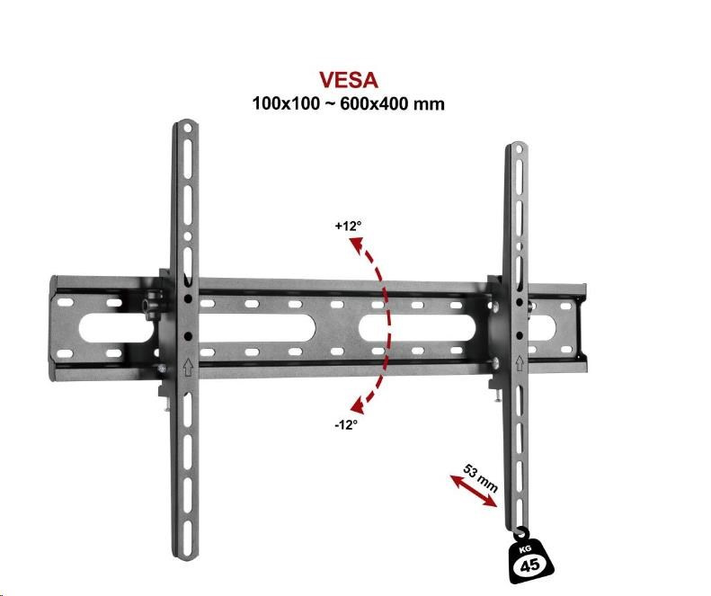 Držiak na televízory a displeje Fiber Novelty FN45T Držiak na televízory a displeje 37" - 75", nakláňanie +12° / -12°, vzdialenosť od steny 53mm, aretácia proti vysadenia, VESA štandardy 100x100 až 600x400, nosnosť 45kg Nakláňací držiak na televízory a displeje Fiber Novelty FN45T Kvalitný nástenný držiak ideálny pre bezpečné zavesenie televízorov alebo displejov s uhlopriečkou 37" až 75". Držiak umožňuje jednoduché nakláňanie obrazovky pod uhlom od +12° až do -12°, potrebný uhol náklonu ľahko zaaretuje. Vzdialenosť obrazovky od steny 53mm, zabezpečenie proti vysadeniu, rozmery základovej dosky 635x100mm, materiál kov. Držiak podporuje VESA štandardy od 100x100 do 600x400mm, nosnosť 45kg. Balenie obsahuje inštalačný materiál. Záruka na držiak 5 rokov. Technické údaje: nosnosť 45 kg na televízory, displeje a monitory s uhlopriečkou 37" - 75" podporuje VESA štandardy 100x100 až 600x400 možnosť nakláňania +12° / -12° zabezpečenie obrazovky v požadovanom náklone vzdialenosť od steny 53mm aretačný mechanizmus proti vysadeniu rozmer základovej dosky 635 x 100 mm balenie obsahuje inštalačný materiál materiál kov farebné prevedenie čierne záruka 5 rokov