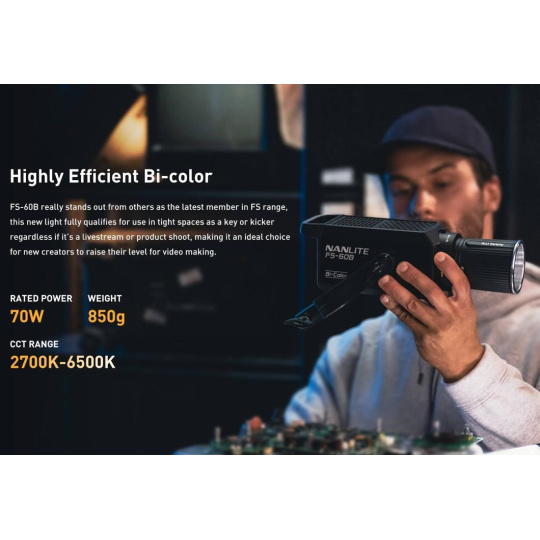 Model FS-60B je štúdiové svetlo pre začiatočníkov, ktorí chcú niečo dosiahnuť ako vo fotografovaní, tak pri natáčaní videí – je to kompaktné dvoubarevné LED svetlo, ktoré za dané peniaze ponúka vysokú hodnotu.