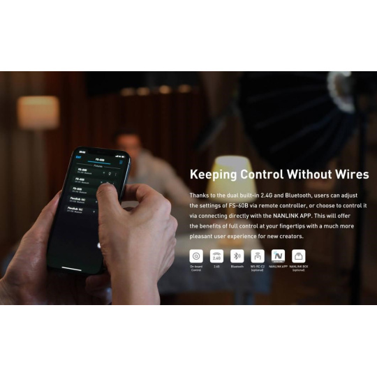 Model FS-60B je vybavený 1,3" OLED displejom pre priame, presné a jednoduché ovládanie. Môžete ho však tiež ovládať na diaľku prostredníctvom Bluetooth a aplikácie NANLINK, ktorá je zadarmo a je určená pre systémy iOS aj Android, pomocou 2.4GHz pripojenia s využitím samostatne dostupného manuálneho diaľkového ovládača WS-RC-C2 alebo boxu vysielača WS-TB-1.