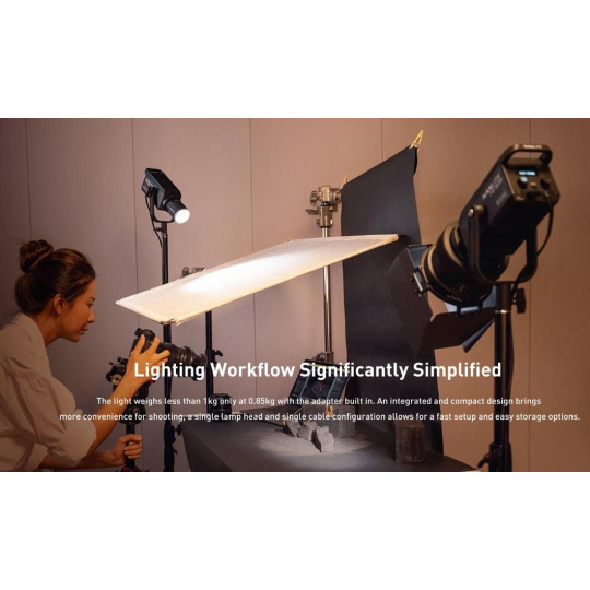Nasviťte si svoje live streamy, videá a fotografie pomocou tohto malého svetla, ktoré váži iba 0,87 kg. Toto kompaktné, výkonné a univerzálne svetlo má reflektor 45°, ktorý ponúka výkon 6 228 lumenov. Vo vzdialenosti 1 metra vyžaruje 13 360 luxov svetla vyváženého ako denné svetlo s teplotou 5 600 K. Svetlo má navyše rozsah farebných teplôt 2700–6500K a vysoké indexy CRI/TLCI s hodnotami 96/97, čo zabezpečuje pokročilé a presné podanie farieb. Dvoubarevné prevedenie svetla ponúka ako teplejšie umelé tóny, tak chladnejšie tóny denného svetla a pri tom zachováva príjemné tóny pleti.