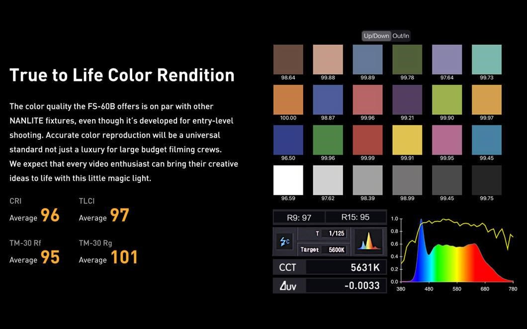 - Presný a veľmi farebný výkon podobný pokročilým svetlám Nanlite