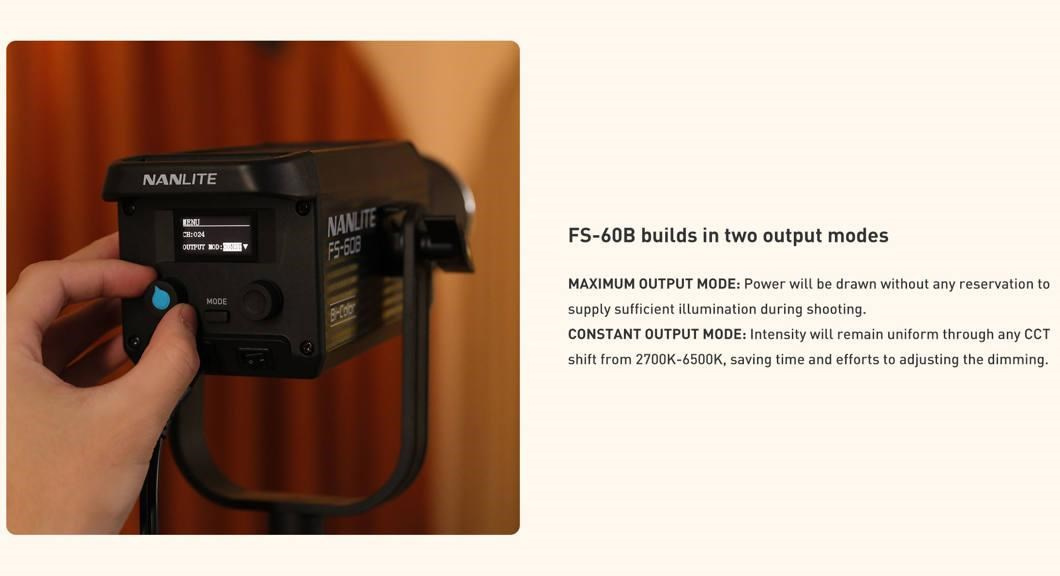 Svetlo FS-60B sa používa jednoducho pomocou dvoch vstavaných tlačidiel na stmievanie od 0 do 100 % a reguláciu teploty farieb. Môžete nastaviť chladnejšie tóny bielej až po teplejšie tóny a čokoľvek medzi tým, a nájsť tak správnu mieru osvetlenia pre vašu konkrétnu scénu. Svetlo má tiež jedno tlačidlo a 1,3" OLED displej pre intuitívne nastavovanie. Okrem jednoduchého ovládania obsahuje model FS-60B vstavaný ventilátor, ktorý neruší zvukové nahrávky, a keď je potrebná absolútna ticho, ho možno vypnúť.