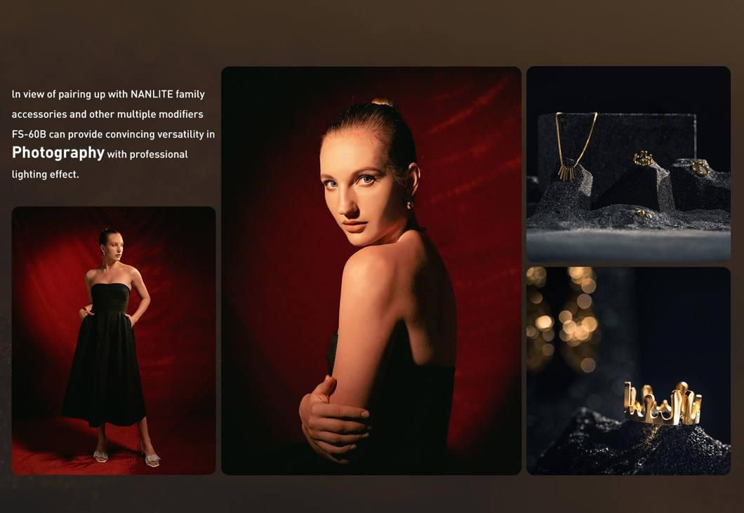 Vďaka predprogramovaným prispôsobiteľným špeciálnym efektom sa so svetlom FS-60B ľahko simulujú špecifické a kreatívne scénáre osvetlenia. Svetlo imituje 12 rôznych svetelných efektov vrátane CCT loop, INT loop, blesku, pulzov, búrky, televízie, paparazzi, sviečok/ohní, vadných žiaroviek, ohňostrojov, výbuchu a zábleskov pri zváraní.