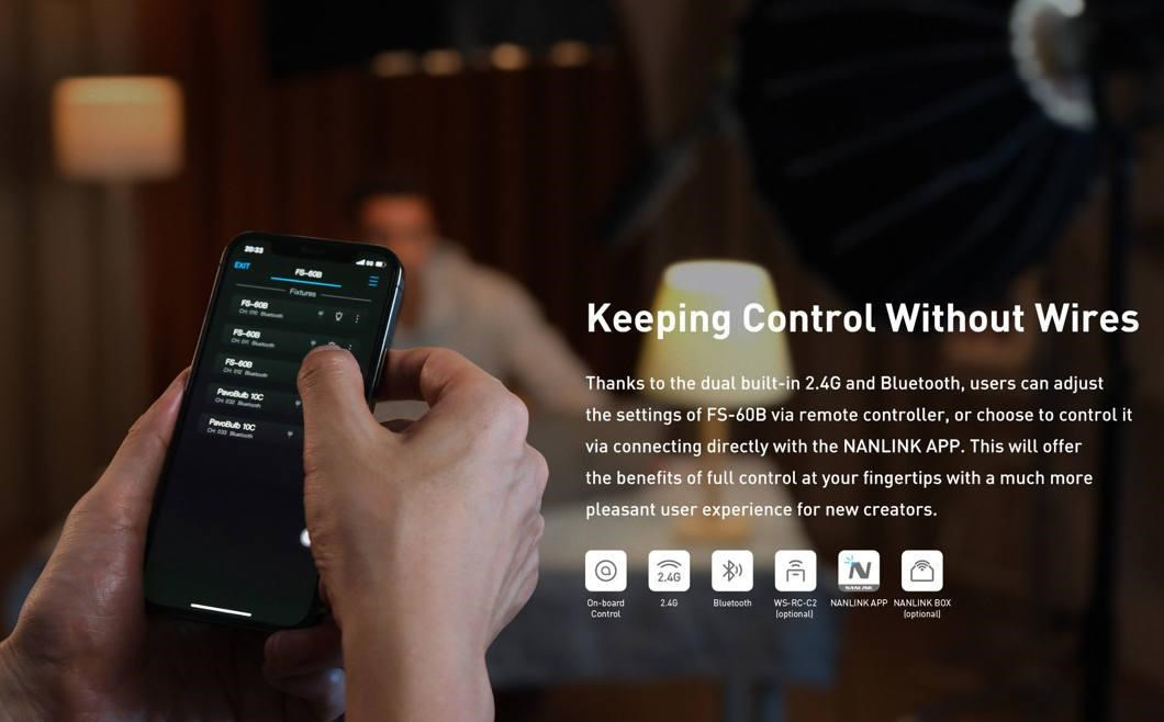 Model FS-60B je vybavený 1,3" OLED displejom pre priame, presné a jednoduché ovládanie. Môžete ho však tiež ovládať na diaľku prostredníctvom Bluetooth a aplikácie NANLINK, ktorá je zadarmo a je určená pre systémy iOS aj Android, pomocou 2.4GHz pripojenia s využitím samostatne dostupného manuálneho diaľkového ovládača WS-RC-C2 alebo boxu vysielača WS-TB-1.