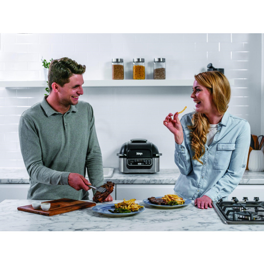 Radi grilujete? Potom si vychutnajte šťavnaté hamburgery, klobásy, zeleninové špízy haloumi a steaky pripravené vo vašej kuchyni po celý rok! Gril a horkovzdušná fritéza Ninja Foodi pripraví ryby, mäso a kukuricu na klasu k dokonalosti s jedinečnou dymovou chuťou. Vďaka viestupňovému nastaveniu teploty - Low, Medium, High, Max - môžete vykúzliť lahodné jedlá aj zo zmrazených produktov.