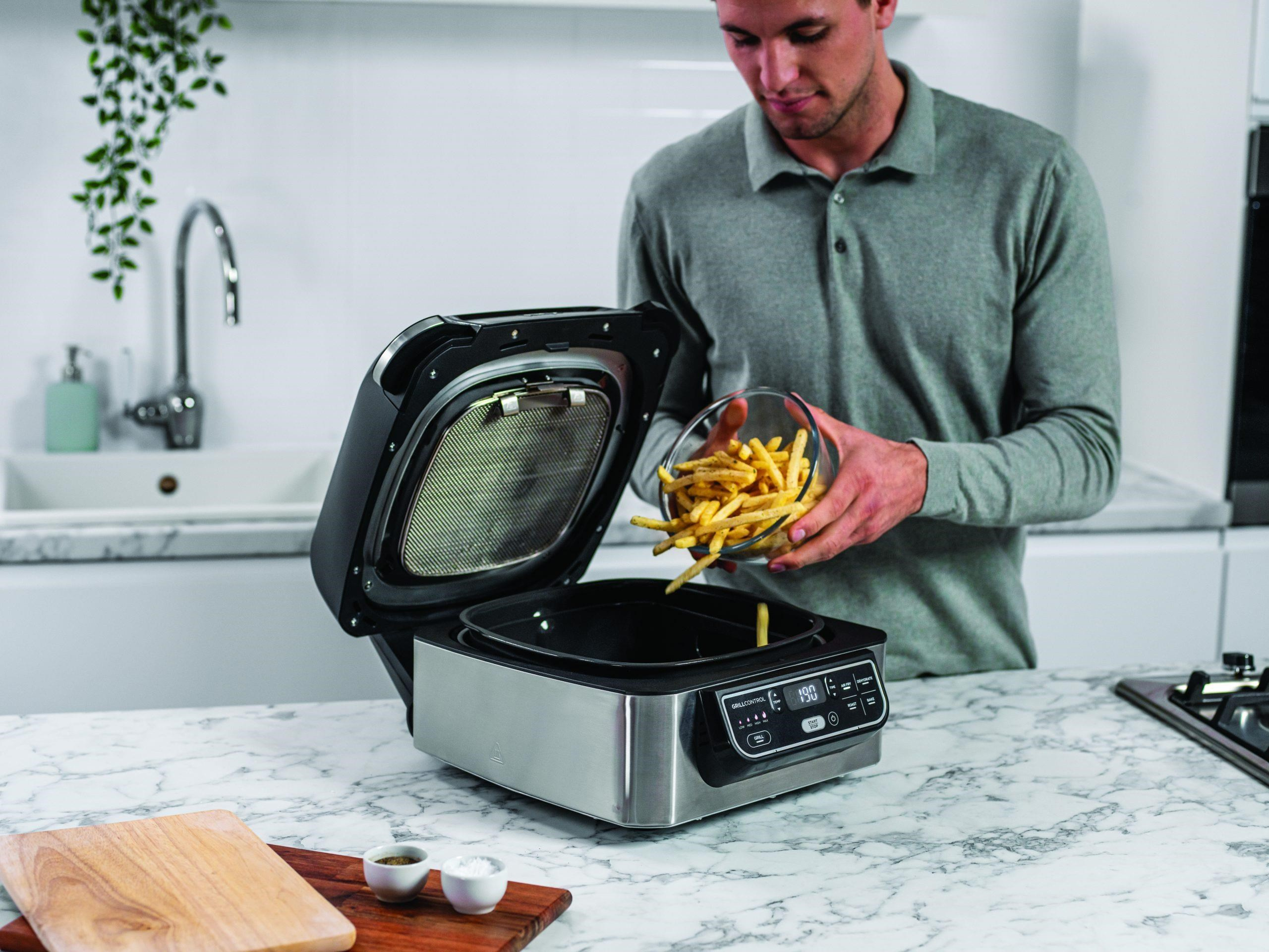 Premenujte gril na horkovzdušnú fritézu a pripravte si lahodné dozlatista opečené hranolky, slané sladké zemiaky, chrumkavé kuracie kúsky a chutné hranolky - a to až s 75 % menej tuku než pri bežných spôsoboch smaženia*. Vychutnajte si rovnako fantastickú chuť s minimálnym množstvom oleja alebo bez neho.