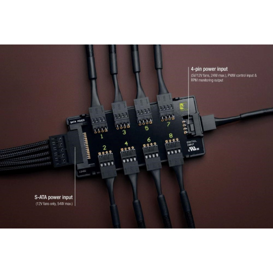 NA-FH1 je vysoko kvalitný, múdro chránený 8-kanálový rozbočovač ventilátorov PWM, ktorý umožňuje spustiť a riadiť až osem ventilátorov PWM súčasne prostredníctvom jediného hlavičky ventilátora PWM na základnej doske alebo samostatných regulátorov, ako je voliteľný NA-FC1. Ventilátory bez PWM je možné riadiť nastavením vstupného napätia. Vďaka podpore 12V aj 5V ventilátorov s 4pólovými PWM a 3-pólovými konektormi je NA-FH1 vysoko flexibilný a vhodný ako pre prostredie PC, tak aj pre ďalšie aplikácie založené na 12V alebo 5V. Môže byť napájaný buď cez vstup S-ATA (pre 12V ventilátory, až 54 W), alebo cez 4-pólový vstup PWM (pre 5V a 12V ventilátory, až 24 W), pričom oboje je chránené proti prepätiu samonastavovacou poistkou pre maximálnu bezpečnosť aj v prípade skratov na pripojených zariadeniach alebo káblach.