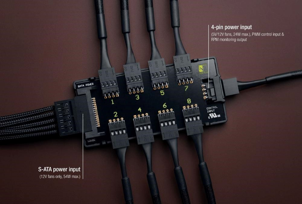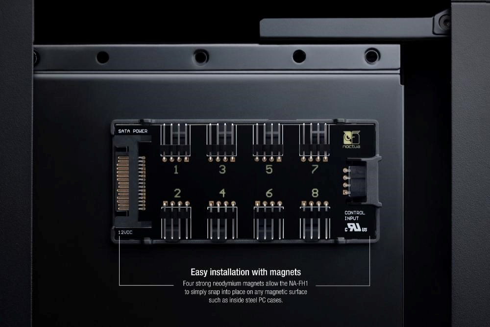 NA-FH1 je vysoko kvalitný, múdro chránený 8-kanálový rozbočovač ventilátorov PWM, ktorý umožňuje spustiť a riadiť až osem ventilátorov PWM súčasne prostredníctvom jediného hlavičky ventilátora PWM na základnej doske alebo samostatných regulátorov, ako je voliteľný NA-FC1. Ventilátory bez PWM je možné riadiť nastavením vstupného napätia. Vďaka podpore 12V aj 5V ventilátorov s 4pólovými PWM a 3-pólovými konektormi je NA-FH1 vysoko flexibilný a vhodný ako pre prostredie PC, tak aj pre ďalšie aplikácie založené na 12V alebo 5V. Môže byť napájaný buď cez vstup S-ATA (pre 12V ventilátory, až 54 W), alebo cez 4-pólový vstup PWM (pre 5V a 12V ventilátory, až 24 W), pričom oboje je chránené proti prepätiu samonastavovacou poistkou pre maximálnu bezpečnosť aj v prípade skratov na pripojených zariadeniach alebo káblach.