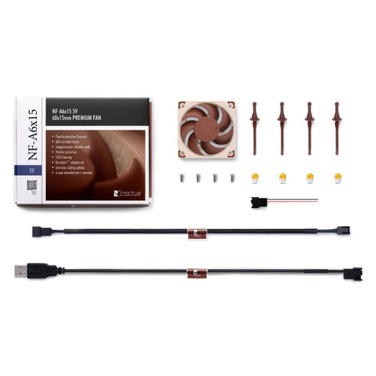NF-A6x15 5V je špeciálna 5V verzia vysoko optimalizovaného tichého 60x15mm ventilátora Noctua s pokročilými aerodynamickými opatreniami, ako sú Flow Acceleration Channels a rám Noctua AAO. Technológia Smooth Commutation Drive a ložisko Noctua SSO2 referenčnej triedy zaručujú vynikajúcu plynulosť chodu a výbornú dlhodobú stabilitu. Vďaka modulárnej kabeláži, sade adaptér *OmniJoin™* a šesťročnej záruke výrobcu je NF-A6x15 5V prvotriednou voľbou pre náročné 5V aplikácie.