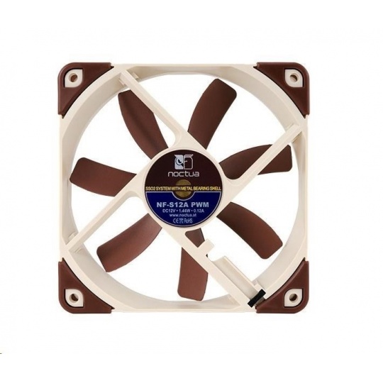 ventilátor, veľmi tichý, rozmery 120x120x25 mm, hlučnosť 17.8 dB, prietok 107.5 m3/h, 300 až 1200 ot/min, optimalizovaná geometria a povrch lopatiek, samostabilizujúce olejové ložisko..