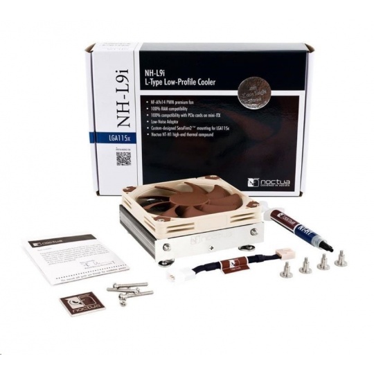 The NH-L9i je prémiový kvalitný tichý chladič procesora pre Intel LGA115x-based HTPCs a systémy s malým formátom. Pri super nízkom profile len 37mm je NH-L9i ideálny pre extrémne tenké prípady a vďaka svojej 95x95mm základni poskytuje plnú kompatibilitu s vysokými RAM modulmi a VGA kartami na mini-ITX základných doskách. Na mieru navrhnutý systém upevnenia SecuFirm2™ pre LGA115x uľahčuje inštaláciu a vďaka vysoko optimalizovanému prémiovému ventilátoru NF-A9x14, ktorý podporuje úplnú automatickú reguláciu otáčok cez PWM, je NH-L9i mimoriadne tichý. Dopĺňa ho renomovaná teplovodivá pasta Noctua NT-H1, ktorá spája všetko, čo používatelia očakávajú od väčších chladičov Noctua, do super kompaktného balenia pre tenké HTPC systémy.