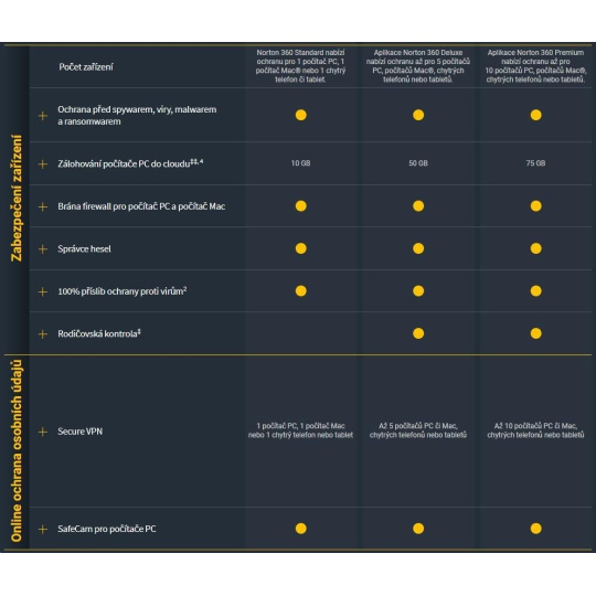 Elektronická licencia Norton 360 Deluxe poskytuje komplexnú ochranu proti škodlivému softvéru až pre 3 počítače PC, Mac, zariadenia so systémom Android alebo iOS, ako aj rodičovskú kontrolu, ktorá pomáha chrániť vaše deti online, správcu hesiel na ukladanie a správu hesiel a funkciu zálohovania z PC do cloudu. Norton 360 Deluxe obsahuje aj sieť VPN pre 3 zariadenia a aplikáciu na ochranu fotoaparátu pre počítače. Určené pre nových používateľov a na obnovenie licencií existujúcich používateľov