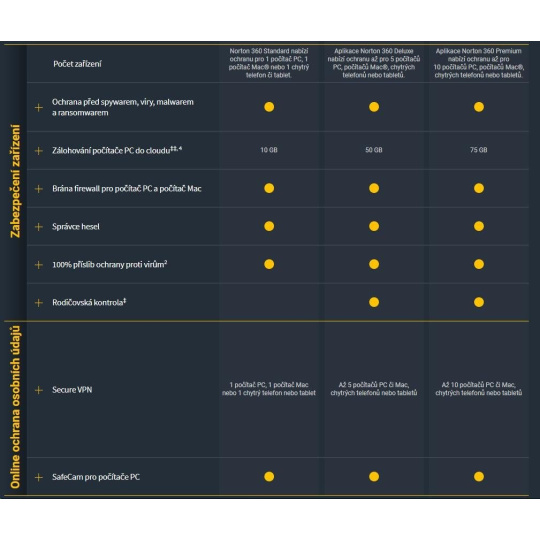 Elektronická licencia Norton 360 Deluxe poskytuje komplexnú ochranu proti škodlivému softvéru až pre 5 počítačov PC, Mac, zariadení so systémom Android alebo iOS, ako aj rodičovskú kontrolu, ktorá pomáha chrániť vaše deti online, správcu hesiel na ukladanie a správu hesiel a funkciu zálohovania z PC do cloudu. Norton 360 Deluxe obsahuje aj sieť VPN pre 5 zariadení a aplikáciu na ochranu fotoaparátu pre počítače. Určené pre nových používateľov a na obnovenie licencií existujúcich používateľov