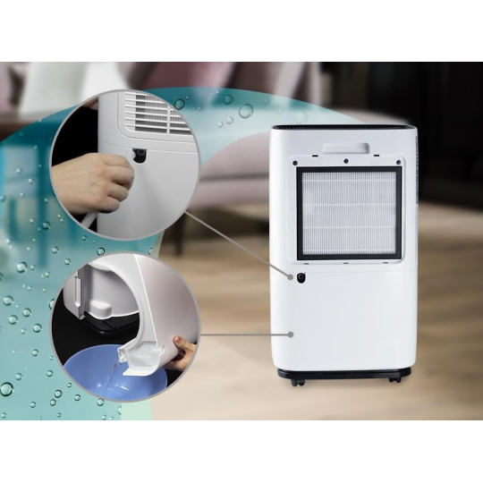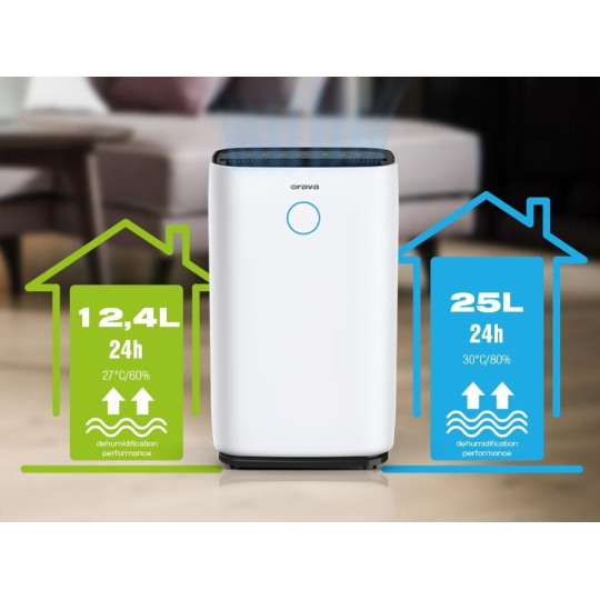 Vysoký výkon dosahuje pri teplote miestnosti 30 °C a 80 % relatívnej vlhkosti, kedy zo vzduchu odsaje až 25 l za 24 hodín, pri teplote miestnosti 27 °C a 60 % relatívnej vlhkosti odsaje 12,4 l za 24 hodín. Objem zachytenej nádoby na vodu je 4 l. Po naplnení tejto nádržky sa odvlhčovač automaticky vypne. Nepretržitý prevádzka je umožnená stálym odtokom vody pomocou hadice, ktorá je súčasťou balenia. Samozrejmosťou je 12-hodinový časovač, kde si môžete nastaviť dobu prevádzky podľa svojich potrieb.