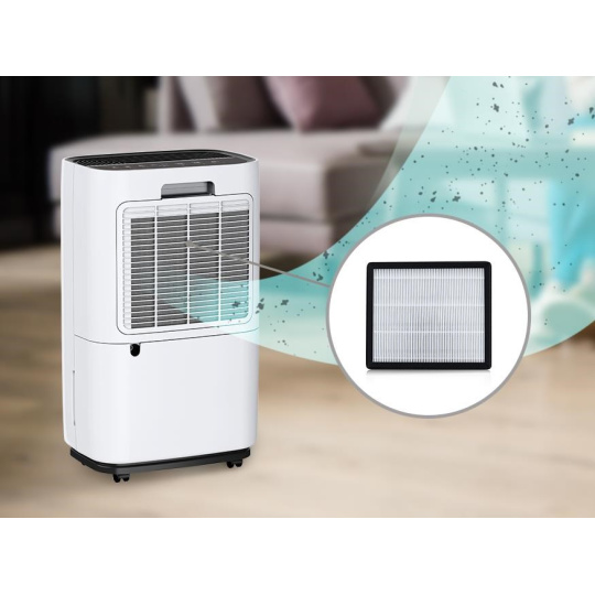 Odvlhčovač DEHUM 1 je vysúšač vzduchu, ktorý dokáže odvlhčiť a čiastočne vyčistiť vzduch v miestnosti. Ide o kompresorový typ vysúšača vzduchu s HEPA filtrom, ktorý účinne zachytáva prachové častice, kour, baktérie alebo peľ.