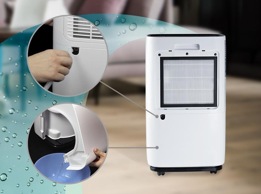 Vysoký výkon dosahuje pri teplote miestnosti 30 °C a 80 % relatívnej vlhkosti, kedy zo vzduchu odsaje až 25 l za 24 hodín, pri teplote miestnosti 27 °C a 60 % relatívnej vlhkosti odsaje 12,4 l za 24 hodín. Objem zachytenej nádoby na vodu je 4 l. Po naplnení tejto nádržky sa odvlhčovač automaticky vypne. Nepretržitý prevádzka je umožnená stálym odtokom vody pomocou hadice, ktorá je súčasťou balenia. Samozrejmosťou je 12-hodinový časovač, kde si môžete nastaviť dobu prevádzky podľa svojich potrieb.