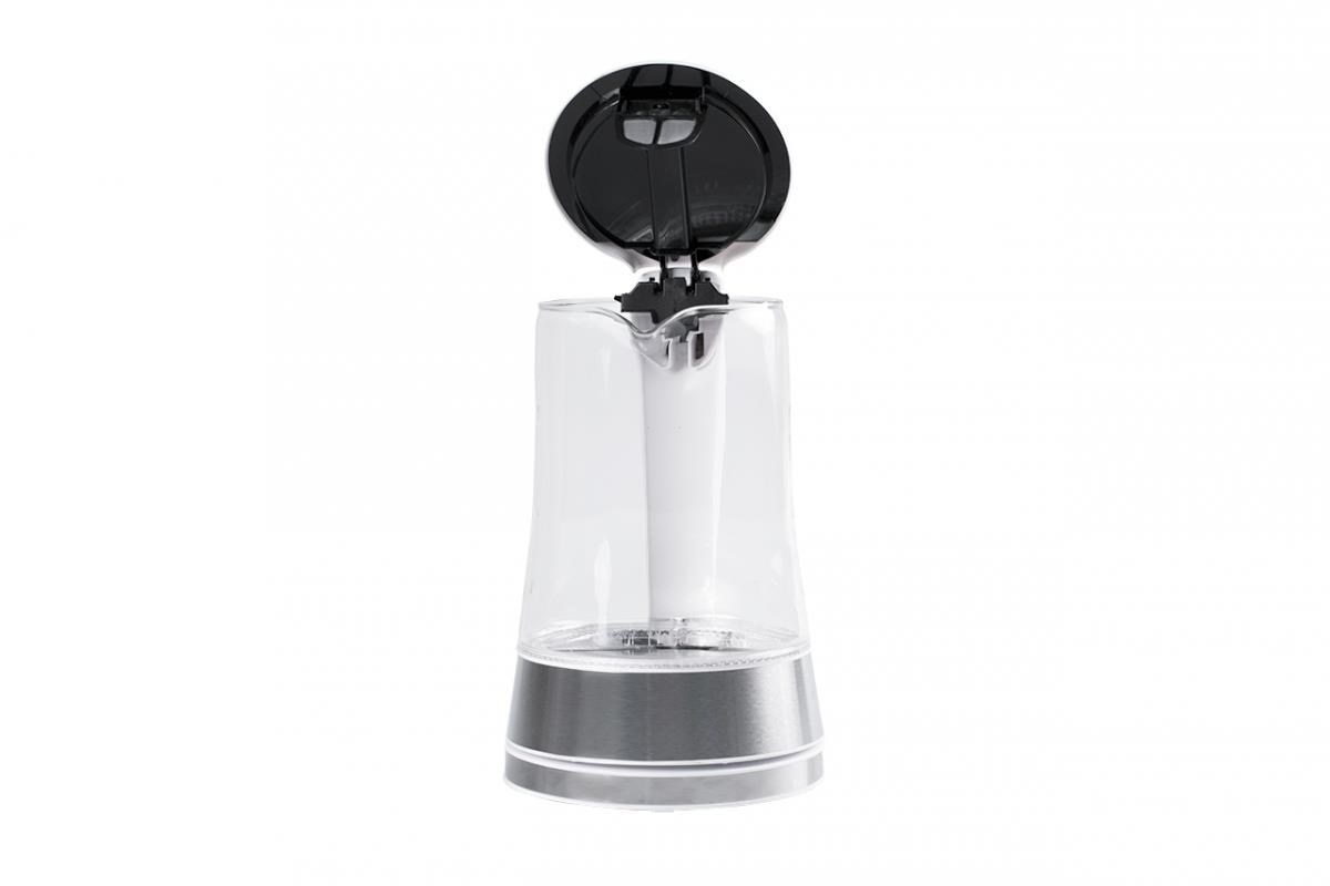 Čajová sklenená kanvica, vnútorné LED osvetlenie počas prevádzky, moderný nerezovo-sklenný dizajn, objem vody: max. 1,7 l, varná nádoba na odnímateľnom 360 ° otočnom podstavci, topné teleso prekryté doskou z ušľachtilej ocele, ochrana pred ohrevom bez vody, automatické vypnutie, elektrický kábel s priestorom na uloženie v podstavci, napájanie: 220 - 240V ~ 50 / 60Hz, max. 2 200 W