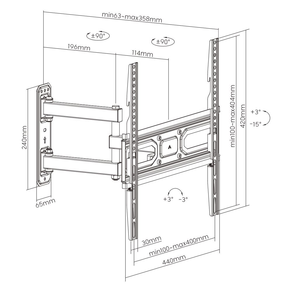 Otočný sklápací držiak TV Fiber Mounts FM78 Kvalitný oceľový držiak na televízory 30-60", nastavenie vzdialenosti TV od steny 63-358mm, otočný až +/-90°, sklopný +3°/-15°, korekcia roviny +/-3°, inštalačný materiál, záruka 5 rokov, VESA 100x100 až 400x400, nosnosť 35kg Otočný, sklopný držiak s nastaviteľnou vzdialenosťou TV od steny Fiber Mounts FM78 Technické údaje: nosnosť 35kg na televízory s uhlopriečkou 30" až 60" podporuje VESA štandardy 100x100 až 400x400 nastavenie vzdialenosti TV od steny 63-358mm otočný až +/- 90° naklápanie TV +3° až -15° korekcia roviny +/- 3° oceľová konštrukcia vynikajúcej kvality ľahká montáž balenie obsahuje inštalačný materiál farebné prevedenie čierne záruka 5 rokov Držiak TV Fiber Mounts FM78 podporuje VESA štandardy: VESA 100x100 VESA 200x100 a 100x200 VESA 200x200 VESA 300x200 a 200x300 VESA 300x300 VESA 400x200 a 200x400 VESA 400x300 a 300x400 VESA 400x400 Na držiaky Fiber Mounts FM78 je možné zavesiť všetky televízory, ktorých hmotnosť nie je vyššia ako 35kg a ktoré podporujú niektorý z vyššie uvedených VESA štandardov. Uvádzaná veľkosť / uhlopriečka televízora nie je podstatná a neurčuje, či je TV na držiak vhodná.