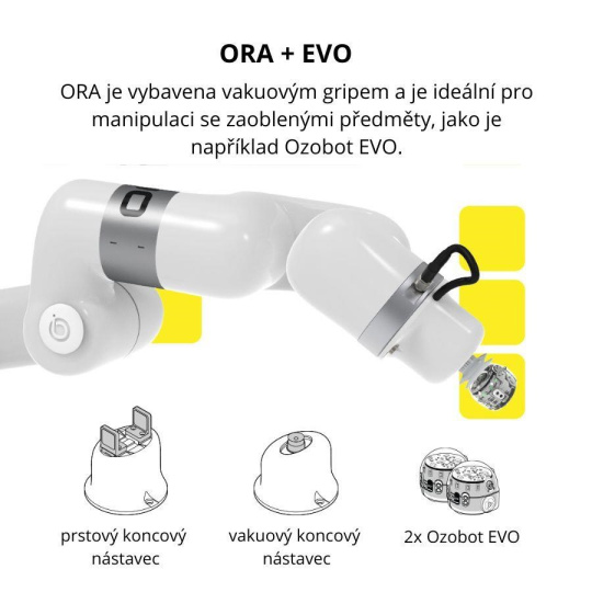 Pri výške takmer tri štvrtiny metra má plne vysunuté rameno ORA polomer dosahu 440 mm. Je vybavené prstovým a vakuovým úchopom, aby bolo schopné zdvíhať, presúvať a manipulovať s predmetmi vo svojom okolí. Vďaka šiestim nezávisle ovládateľným osám môžu študenti naprogramovať ORA tak, aby pracovala takmer v ľubovoľnej polohe a splnila akúkoľvek úlohu alebo výzvu, s ktorou sa stretnú. Vďaka konštrukcii plug and play je kobota ľahko zprovozniteľná pomocou priloženého napájacieho zdroja, núdzového zastavenia a montážneho príslušenstva. A ani jej programovanie nie je nerešitelnou rébou. Programy pre robotické rameno budete vytvárať v blokovom Ozobot Editoru, ktorý je založený na známej rozhraní Ozobot Blockly. Rozlišuje niekoľko úrovní kódovania, aby prácu v ňom zvládli ako začiatočníci, tak aj pokročilí používatelia. Tento editor je tiež možné prepnúť na programovací jazyk Python.