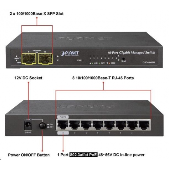 Planet GSD-1002M Switch, 8 x 10/100/1000 + 2 x 100/1000 Combo port, management, PoE-in napájení
