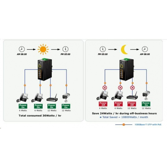 Planet IGS-10020HPT PoE switch 8x 1000Base-T, 2x SFP, 802.3at 270W, IP30, -40 až 75°C, SNMP, IGMPv3, IPv6 Inteligentné prepínače pre priemyselný Ethernet sú určené do náročných prevádzkových podmienok so širokým rozsahom prevádzkových teplôt, neistým napájaním a častými otrasmi. Zároveň poskytujú vynikajúce možnosti viacnásobného prepojenia na dosiahnutie robustného prepojenia systému s veľmi nízkym časom obnovy. IGS-10020HPT je vybavený pre redundanciu okrem známej metódy Spanning Tree (ktorej čas obnovy sa pohybuje v sekundách) najmä špecializovanou funkciou "Redundant ring", ktorá má čas obnovy a nájdenia novej cesty do 300 ms. Ako prepínač PoE môže priamo napájať až 8 zariadení IEEE 802.3at, a preto je ideálny pre aplikácie so zníženou dostupnosťou energie. Prepínače radu IGS sa ľahko inštalujú na štandardnú lištu DIN alebo priamo na stenu a umožňujú nasadenie známej technológie Ethernet aj v priemyselnom prostredí. Sú vhodné aj na inštaláciu vo vonkajších krytoch s veľkými výkyvmi prevádzkových teplôt (typicky bezdrôtové aplikácie a aplikácie MAN ISP). Vlastnosti: - 8 portov 1000Base-T, prepínanie, plný duplex (1000/2000 Mb/s), automatické vyjednávanie (10/100/1000 Mb/s), automatická detekcia priameho/krížového kábla na každom porte - pre všetky PoE IEEE 802.3at injektory so zaťažiteľnosťou 30 W/port, spolu až 270 W - 2 porty SFP na inštaláciu modulov 1000Base-SX/LX/BX alebo 100Base-FX - Priepustnosť: zbernica 20 Gb/s, 14,8 Mp/s (64B) - Podpora Jumbo Frame do 9 kB, 8k MAC adries, 4Mbitová vyrovnávacia pamäť - 255 VLAN IEEE 802.1Q, siete založené na MAC alebo protokole VLAN, VoIP VLAN - port trunking IEEE 802.3ad LACP - IGMP v1,v2,v3 až do 256 multicast skupín, režim IGMP querier - 8-úrovňová prioritizácia prevádzky QoS podľa portov, DSCP/ToS, 802.1p alebo 802.1Q tagy - podpora Spanning Tree IEEE 802.1d, Rapid Spanning Tree IEEE 802.1w - IP/MAC ACL (access control list) do 123 pravidel, MAC/IP binding - DHCP snooping - port shaper - administrace Web/SNMPv3 s podporou zabezpečeného přenosu SSH/SSL - podpora IPv4/IPv6 - PoE scheduler pro možnost zapínání/vypínaní napájení podle časového plánu - pole LED indikátorů pro diagnostiku provozu - instalace na DIN lištu, montážní díl součástí - instalace na zeď, montážní díl součástí - krytí IP30 - napájení: 48V DC redundantní, připojení možné ze dvou různých zdrojů (nejsou součástí balení); vlastní příkon do 30W - ochrana proti přepólování, připojení napájení na svorkovnici, umístění na spodním panelu (nepřekáží při montáži na zeď) - přepěťová ochrana napájení do 6kV proti napěťovým špičkám (EFT) - přepěťová ochrana LAN portů do 6kV proti elektrostatickému náboji (ESD) - spínací poplachové relé (24V/1A) při výpadku primárního napájení - zařízení je odolné proti pádu (IEC-60068-2-32) z výšky 7.