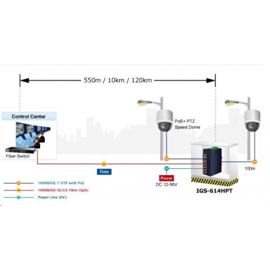 Priemyselný prepínač ponúka päť portov RJ-45 10/100/1000Base-T, z ktorých štyri podporujú napájanie PoE+ až do 36 W na port, a 1 slot SFP (1000Base-SX/LX/BX) kompatibilný so 100Base-FX. Vďaka kovovému puzdru s certifikátom IP40 odoláva vysokým teplotám od -40 °C do 75 °C, takže je vhodný na použitie v náročných podmienkach. Prepínacia kapacita je 12 Gb/s a priepustnosť 8,93 Mpps. ZÁKLADNÉ ŠPECIFIKÁCIE Fyzické vlastnosti Porty: 5 x RJ-45 10/100/1000Base-T, 1 x SFP slot (1000Base-SX/LX/BX) Pamäť: 4k MAC adries, 1 Mb vyrovnávacia pamäť Priepustnosť: 12 Gb/s zbernica, 8,93 Mpps (64B) prevádzkovo neblokované Podpora prenosu JumboFrame 9 KB Konštrukcia: lišta DIN, montáž na stenu Napájanie: 12 - 56 V DC (max. 7 A) redundantný, s funkciou ochrany proti prepólovaniu (napájací zdroj nie je súčasťou dodávky) Ochrana: ESD do 6 kV DC Prevádzková teplota: -40 °C - 75 °C Rozmery: 135 x 87 x 50 mm Hmotnosť: 605 g Funkcia POE: Celkový výkon napájania: 120 W IEEE 802.3at Počet injektorů: 4 x až 36 W Typ napájení: End-span Průmyslové vlastnosti: zařízení je odolné proti pádu (IEC-60068-2-32) z výšky 75 cm na všechny dopadové části zařízení je odolné proti vibracím (IEC-60068-2-6) zařízení je odolné proti přetížení krátkodobému zrychlení 50g, dlouhodobému 4g, (IEC-60068-2-27) elektrická bezpečnost dle CE EN-60950 EMC Elektronická kompatibilita (EMI): ČSN EN 55032:2015+AC 2016 - Elektromagnetická kompatibilita multimediálních zařízení EMC požadavky na odolnost (EMS) : ČSN EN 55024 A1:2015 - Zařízení informační techniky ČSN EN 55035:2017 - Elektromagnetická kompatibilita multimediálních zařízení ČSN EN 61000-4-2:2008 - Elektrostatický výboj ESD ČSN EN 61000-4-3 A2:2010 - Vyzařované vysokofrekvenční elektromagnetické pole ČSN EN 61000-4-4:2012 - Rychlé elektrické přechodné jevy/skupiny impulzů EFT ČSN EN 61000-4-5:2014 - Rázový impuls a přepětí ČSN EN 61000-4-6:2013 - Odolnost proti rušením š.