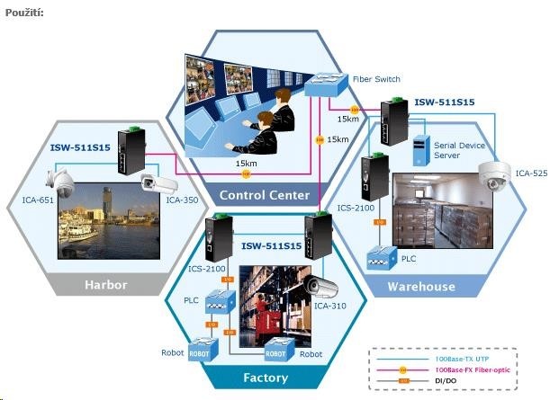 Planet ISW-511, 4x 10/100Base-TX+ 1x 100FX 2km, MM, DIN, IP30 Priemyselné ethernetové prepínače sú určené do náročných prevádzkových podmienok so širokým rozsahom prevádzkových teplôt, neistým napájaním a častými otrasmi. Prepínače radu ISW sa ľahko inštalujú na štandardnú lištu DIN alebo priamo na stenu a umožňujú nasadenie známej technológie Ethernet aj v priemyselnom prostredí. Sú vhodné aj na inštaláciu vo vonkajších krytoch s veľkými výkyvmi prevádzkových teplôt (typicky bezdrôtové aplikácie a aplikácie MAN ISP). Vlastnosti: - 4 porty 100Base-TX, prepínanie, plný duplex (100/200 Mb/s), automatické vyjednávanie (10/100 Mb/s), automatická detekcia priameho/krosového kábla na každom porte - 1 port 100Base-FX, plný duplex, konektory SC, multimodemový, pre vlákna 50/125um a 62,5/125um, dosah 2 km, vlnová dĺžka 1300 nm, zdvih min. 15,5 dB (vysielací výkon max. -14dBm, min. -19dBm, citlivosť príjmu -34,5dBm) - 1M vyrovnávacia pamäť, priepustnosť zbernice 1Gbps - sústava LED indikátorov pre diagnostiku prevádzky - montáž na DIN lištu, montážny diel je súčasťou dodávky - montáž na stenu, montážny diel je súčasťou dodávky - krytie IP30, celohliníkový kryt - napájanie: 12-48V DC redundantné, možnosť pripojenia z dvoch rôznych napájacích zdrojov (nie sú súčasťou dodávky) - ochrana proti prepólovaniu, pripojenie napájania na svorkovnicu, umiestnenie na spodnom paneli (neprekáža pri montáži na stenu) - prioritizácia prevádzky QoS podľa portov, ToS, 802.1p - zariadenie je odolné voči pádu (IEC-60068-2-32) z výšky 75 cm na všetky nárazové časti - zariadenie je odolné voči vibráciám (IEC-60068-2-6) 10-500-10Hz, 4x g, 0,5okt/min - zariadenie je odolné voči preťaženiu krátkodobé zrýchlenie 50g, dlhodobé 4g, (IEC-60068-2-27) - EMI/EMS, elektromagnetická kompatibilita a kompatibilita podľa CE EN-6100-4-2,3,4,5,6 - elektrická bezpečnosť podľa CE EN-60950 - prevádzková teplota -10 až 60 st. C, vlhkosť do 95 % - teplota skladovania -40 až 85 st. C - spotreba energie 9,1 W - rozmery 135 x 97 x 32 mm..