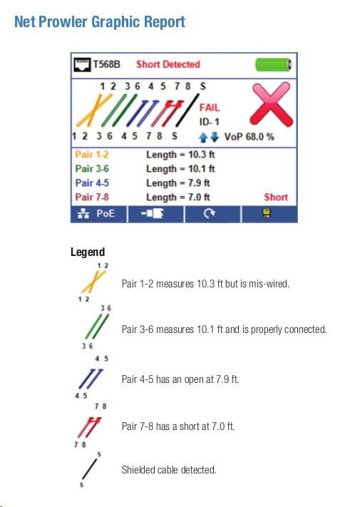- Testuje ethernetovú kabeláž CAT3/5e/6/6a a overuje konektivitu pomocou testov prerušenia, skratov, nesprávneho zapojenia, rozdelenia a prepínania.