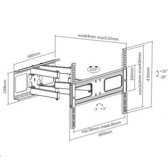 Poctivý nástenný polohovací držiak TV Fiber Mounts Prominent Držiak na TV 37-70", otočný, sklopný, výsuvný, pevná konštrukcia, nosnosť 50kg Nástenný držiak s pevnou konštrukciou na spoľahlivé a bezpečné zavesenie televízorov s uhlopriečkou 37-70". Televízor je po zavesení na tento držiak možné vysúvať od steny, otáčať do strán, nakláňať a v prípade nepresnej inštalácie korigovať rovinu obrazovky. Držiak Fiber Mounts Prominent unesie televízory s hmotnosťou až 50kg a podporuje VESA štandardy 200x200 až 600x400. Farba čierna, záruka 5 rokov. Technické údaje: nosnosť 50kg podpora VESA štandardov pre zavesenie TV 200x200 až 600x400 ideálny pre televízory s uhlopriečkou 37" až 70" výsuvný, nastaviteľná vzdialenosť TV od steny 64mm až 510mm otáčanie televízora do strán +/- 60° možnosť veľkého náklonu televízie dolu až 20°, hore až 10° možnosť korekcie roviny obrazovky kvalitná, robustná konštrukcia bezpečné zavesenie televízorov farba čierna záruka 5 rokov Držiak Fiber Mounts Prominent podporuje VESA štandardy: VESA 200x200 VESA 300x200 a 200x300 VESA 300x300 VESA 400x200 a 200x400 VESA 400x300 a 300x400 VESA 400x400 VESA 600x400