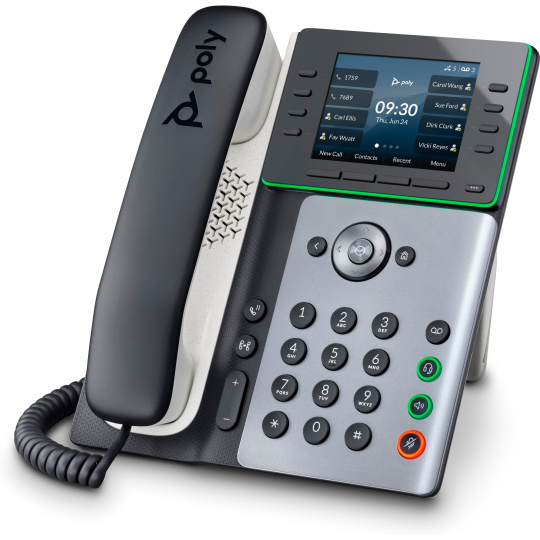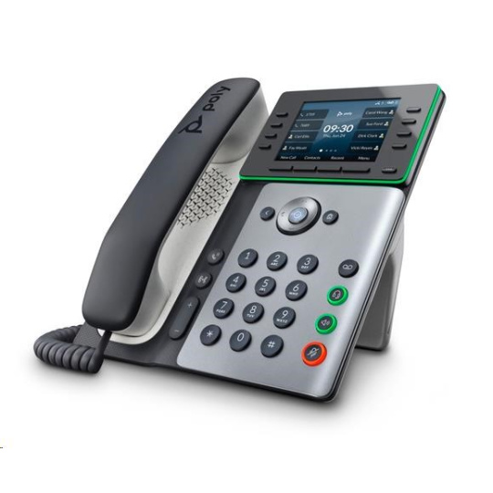 | Zvuk | Generovanie komfortného šumu; Generovanie tónov DTMF (RFC 2833 a v pásme); Prenos zvukových paketov s krátkym oneskorením; Adaptívne medzipamäte pre fluktuácie 8,9 cm (3,5 palca) Edge 25,8 x 30,6 x 8,9 cm Poly HD Voice; Technológia Poly Acoustic Clarity zabezpečuje plne obojsmerné konverzácie, potlačenie akustickej ozveny a šumu v pozadí; Technológia Poly Acoustic Fence eliminuje hluk v pozadí pri používaní slúchadla alebo káblovej náhlavnej súpravy; Technológia Poly NoiseBlockAI odstraňuje väčšinu hluku v pozadí pri používaní reproduktora; Aplikácia Poly Computer Audio Connector nainštalovaná v počítači (iba v systéme Windows) umožňuje vybrať telefón na zvukový vstup/výstup počítača a používanie slúchadla telefónu, voliteľnej náhlavnej súpravy a reproduktora ovládaného bez rúk s počítačovými aplikáciami; |