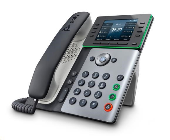 | Zvuk | Generovanie komfortného šumu; Generovanie tónov DTMF (RFC 2833 a v pásme); Prenos zvukových paketov s krátkym oneskorením; Adaptívne medzipamäte pre fluktuácie 8,9 cm (3,5 palca) Edge 25,8 x 30,6 x 8,9 cm Poly HD Voice; Technológia Poly Acoustic Clarity zabezpečuje plne obojsmerné konverzácie, potlačenie akustickej ozveny a šumu v pozadí; Technológia Poly Acoustic Fence eliminuje hluk v pozadí pri používaní slúchadla alebo káblovej náhlavnej súpravy; Technológia Poly NoiseBlockAI odstraňuje väčšinu hluku v pozadí pri používaní reproduktora; Aplikácia Poly Computer Audio Connector nainštalovaná v počítači (iba v systéme Windows) umožňuje vybrať telefón na zvukový vstup/výstup počítača a používanie slúchadla telefónu, voliteľnej náhlavnej súpravy a reproduktora ovládaného bez rúk s počítačovými aplikáciami; |