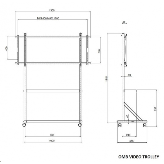 Profesionální vozík/stojan držák na televizory 55-100", pojezdová kolečka s brzdou, OMB VIDEO TROLLEY