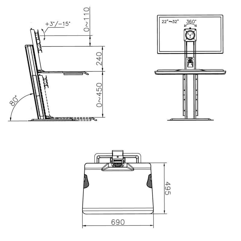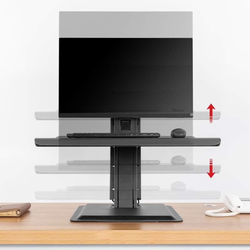 Pracovná stanica NB ST15B Ergonomická pracovná stanica - stolový stojan na monitor 19-32", s policou na klávesnicu a myš, výškovo nastaviteľná pre prácu v stoji alebo v sede, úprava výšky, sklonu a rotácie monitora, VESA 75x75 a 100x100, nosnosť 11kg Profesionálna pracovná stanica pre moderné kancelárie - rýchla a jednoduchá zmena polohy pre prácu v sede alebo v stoji vďaka pokročilému systému zmeny výšky. Stojan podporuje VESA štandardy 75x75 a 100x100, umožní Vám rýchlu zmenu výšky +/- 45cm. Nastavenie polohy samotného monitora: úprava výšky od police +/- 11cm, náklon +3°/-15°, horizontálne alebo vertikálne otočenie. Nosnosť 11kg. Profesionálna konštrukcia, estetický dizajn, luxusné čierne prevedenie. Systém na vedenie káblov. Záruka 5 rokov. Pracovná stanica na jednoduchú zmenu polohy monitora a klávesnice s myšou pre prácu v sede alebo v stoji, najvyššia kvalita, top dizajn - Fiber Mounts ST15B Technické údaje: nosnosť 11kg na monitory s uhlopriečkou 19-32" podpora VESA štandardov 75x75 a 100x100 rýchle nastavenie výšky pre prácu v sede alebo v stoji +/- 45cm pokročilý systém výškovej polohy - ľahko, rýchlo, bez náradia výškové polohovanie samotného monitora 110mm polica na klávesnicu a myš s rozmermi 690x495mm základňa o rozmeroch 450x480mm (minimálny potrebný priestor na stole) nastavenie náklonu monitora +3° / -15° systém pre skryté vedenie káblov esteticky ukrytý USB port profesionálna pracovná stanica najvyššej kvality výnimočná stabilita krásny dizajn v čiernom prevedení záruka 5 rokov Stolová pracovná stanica do kancelárie pre prácu v sede alebo v stoji - Fiber Mounts ST15B Pracovná stanica NB ST15B podporuje VESA štandardy: VESA 75x75 VESA 100x100 Pracovná stanica, profesionálna, nastaviteľný výškový rozsah monitora od police na klávesnicu s myšou - Fiber Mounts ST15B Pracovná stanica pre prácu v stoji alebo v sede, výškovo polohovateľná 450mm - Fiber Mounts ST15B Nastavenie náklonu monitora na pracovnej stanici Fiber Mounts ST15B Pracovná stanica do kancelárie pre prácu v stoji alebo v sede, pokročilý systém výškovej polohy - Fiber Mounts ST15B Profesionálna stolová pracovná stanica pre pohodlnú prácu v sede alebo v stoji, rýchla a jednoduchá zmena požadovanej výšky. Znižuje bolesť chrbta a zvyšuje pracovný výkon a pohodlie. Krásny dizajn, ktorý si získa nielen Vás, ale úplne každého.