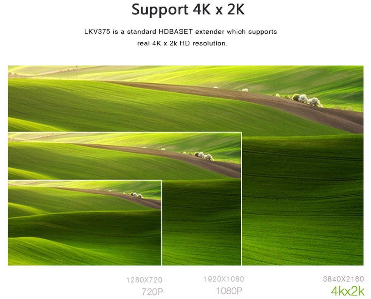 - Umožňuje rozlíšenie až 4Kx2K@30Hz cez Cat5e/Cat6