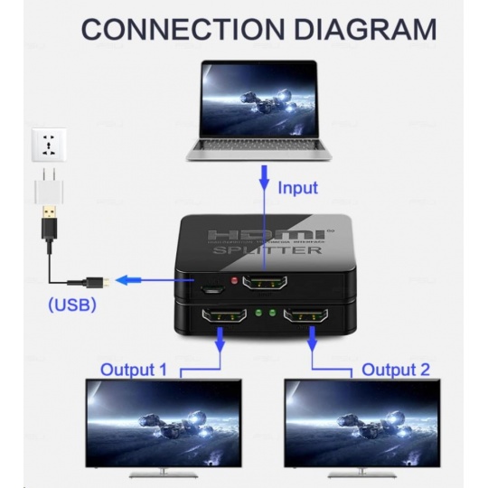 HDMI video rozdeľovač 1 => 2 porty, 3D, 4K x 2K, FULL HD s USB napájaním