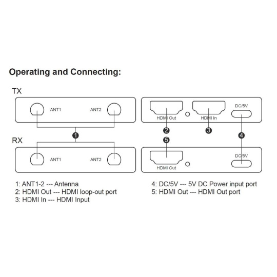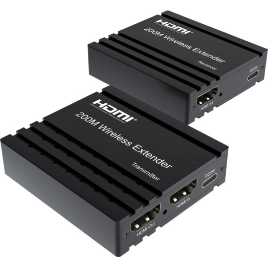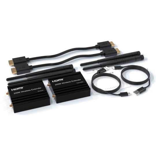 - Bezdrôtový vysielač a prijímač signálu HDMI umožňuje pripojiť HDMI monitor alebo projektor na vzdialenosť až 200m na otvorenom priestranstve.