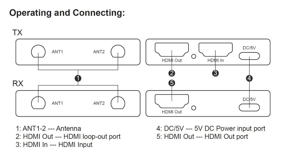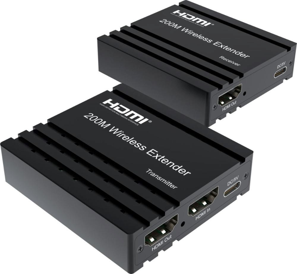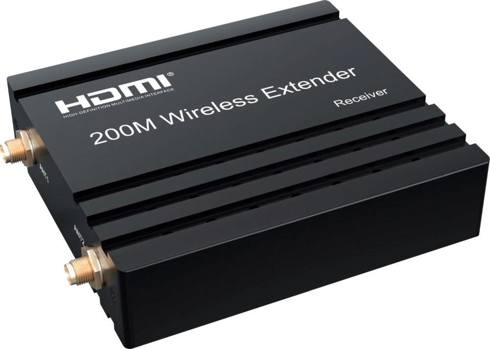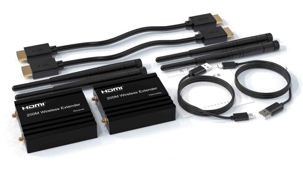 - Bezdrôtový vysielač a prijímač signálu HDMI umožňuje pripojiť HDMI monitor alebo projektor na vzdialenosť až 200m na otvorenom priestranstve.