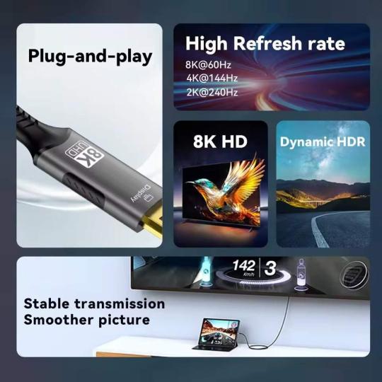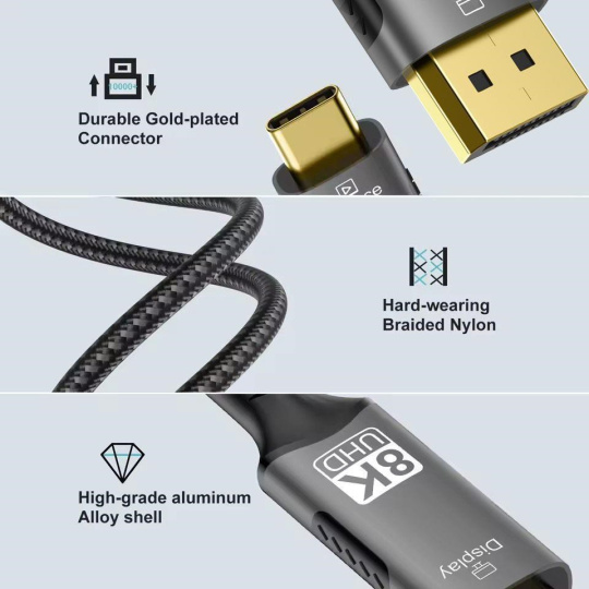 Kábel s najnovšou špecifikáciou DP1.4 prichádza, podporuje rozlíšenie až 8K@60 Hz s HDCP 2.2, umožňuje pripojiť a zobrazovať na najnovších monitoroch alebo televízoroch v rozlíšení ultra HD 8K@60Hz