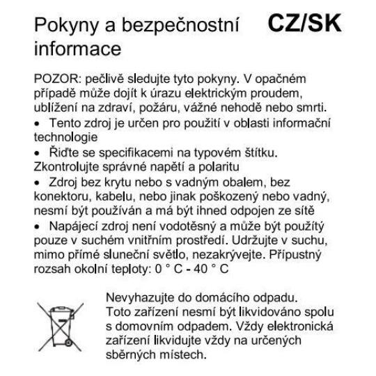- výstupný konektor: vonkajší priemer konektora: 5,5mm, vnútorný priemer konektora: 2,1mm