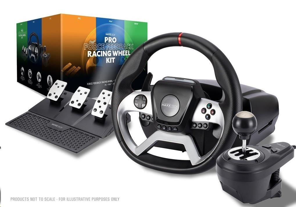 Obsahuje volant so spätnou väzbou, sadu 3 pedálov a radiacu páku.
