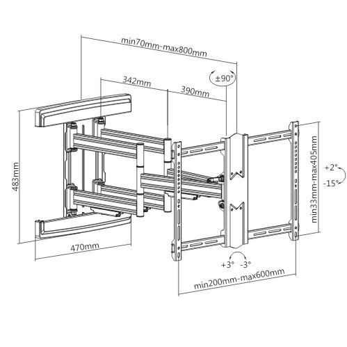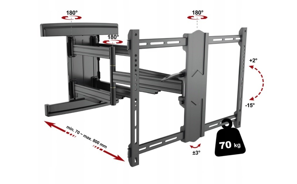 Profesionálny držiak TV Fiber Novelty Noston Profesionálny nástenný držiak na TV 43-90", otočný, sklápací, dĺžkové nastavenie, korekcia roviny, vedenie káblov, krásny dizajn a špičková kvalita, VESA štandardy 200x100 až 600x400, nosnosť 70kg Plne nastaviteľný držiak na všetky typy televízorov s uhlopriečkou 43" až 90", ktorý je v krásnom dizajne a zároveň poskytuje naozaj EXTRA pevné a bezpečné zavesenie televízorov s hmotnosťou až 70kg. Aj pri tejto záťaži môžete každú zavesenú televíziu vysunúť od steny od minimálnej dĺžky 70mm až po neuveriteľných 800mm. Tento držiak v dĺžkovom nastavení predčí takmer všetky držiaky, pritom za zlomok ceny týchto držiakov. Televíziu môžete otáčať do strán a naklápať. V prípade nepresnej inštalácie má držiak systém na korekciu roviny obrazovky. Polohovanie je jednoduché a zvládnu to aj deti, pričom budete mať vždy istotu úplnej bezpečnosti aj pri najväčších a naozaj ťažkých televízoroch. Ramena držiaka sú osadené krytkami pre vedenie káblov. V balení nájdete aj montážny materiál. Farebné prevedenie čierne. Záruka 5 rokov. Profesionálny držiak na televízie v najvyššej kvalite a špičkovom prevedení Technické údaje: nosnosť 70kg podpora VESA štandardu 200x100 až 600x400 odporúčame na TV s uhlopriečkami 43" až 90" nastavenie vzdialenosti od steny 70-800mm otáčanie TV do strán +/-75° možnosť náklonu obrazovky + 2° až - 15° korekcia roviny obrazovky + 3° až -3° systém na vedenie káblov extrémne pevná a spoľahlivá konštrukcia najvyššia bezpečnosť veľmi pekný dizajn profesionálny polohovateľný držiak na televízie farebné prevedenie čierne montážny materiál súčasťou balenia záruka 5 rokov Profesionálny otočný sklápací a výsuvný držiak na televízie Fiber Novelty Noston Televízny držiak Fiber Novelty Noston podporuje VESA štandardy: VESA 200x100 VESA 200x200 VESA 300x100 a 100x300 VESA 300x200 a 200x300 VESA 300x300 VESA 400x200 a 200x400 VESA 400x300 a 300x400 VESA 400x400 VESA 600x400 Bezpečné a spoľahlivé zavesenie všetkých typov televízorov s uhlopriečkou 43 až 90 palcov (94 až 230cm) a to aj pri maximálnej záťaži 70kg a maximálnom vysunutí obrazovky od steny na vzdialenosť 80cm. Pre zabezpečenie bezpečnosti je nutné naozaj spoľahlivé ukotvenie držiaka do steny.