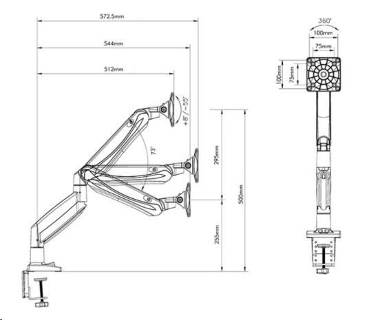 Profesionálny kancelársky držiak LCD monitoru Fiber Mounts F85A Kancelársky držiak na PC monitory 19÷32", nastavenie výšky, otáčanie, náklon, rotácia, korekcia roviny, 2 typy uchytenia na stolovú dosku, USB konektory, systém vedenia kábláže Profesionálny stolový držiak na uchytenie a polohovanie PC LCD monitorov s uhlopriečkou 19 až 32 palcov. Držiak vám umožní 3D polohovanie obrazovky monitora: otáčanie do strán, náklon, nastavenie vzdialenosti od stolového uchytenia, výšková polohovateľnosť, rotácia monitora. Držiak je osadený USB konektormi a má systém pre vedenie kábláže. V balení nájdete 2 typy uchytenia na stolovú dosku o priemere až 90mm: na okraj stolu alebo do priestoru stolu. Držiak podporuje VESA štandardy 75x75 a 100x100, v prípade potreby je možné dokúpiť rozšírenie na 200x100 alebo aj 200x200. Zavesiť môžete všetky monitory a televízory s hmotnosťou 2 až 8kg. Výšková polohovateľnosť je zabezpečená plynovým piestom s nastaviteľnou tuhosťou - jednoduchá regulácia. Profesionálna kvalita a krásny dizajn držiaku Fiber Mounts F85A umožní použitie v firmách, kanceláriách, pracovniach, ale aj domácnostiach a detských izbách. Technické údaje: zaťaženie 2÷8kg podporuje VESA štandardy 75x75 a 100x100 možnosť rozšírenia VESA na 200x100 alebo 200x200 odporúčame na monitory a televízory s uhlopriečkou 19 až 32" otáčanie do strán +/-90° náklon: nahor +55°, nadol -8° celková výška 500mm výšková polohovateľnosť v rozmedzí 295mm maximálna vzdialenosť od stolového uchytenia 572mm funkcia PIVOT - rotácia monitora, nastavenie horizontálnej alebo vertikálnej polohy monitora korekcia roviny monitora integrované USB konektory súčasťou balenia 2 typy uchytenia na stolovú dosku: na okraj stolu alebo do priestoru profesionálna kvalita ľahká nastaviteľnosť krásny dizajn záruka 2 roky Kancelársky držiak na LCD monitory Fiber Mounts F85A podporuje VESA štandardy: VESA 75x75 VESA 100x100 možnosť dokúpiť rozšírenie VESA 200x100 možnosť dokúpiť rozšírenie VESA 200x200