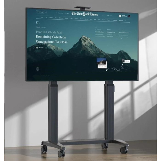 profesionálny TV stojan NB GF150 Profesionálny motorizovaný stojan na TV 60" - 120", elektrické nastavenie výšky 1250-1750 mm, nastavenie výšky obrazovky na paneli alebo diaľkovým ovládaním, zásuvka na pripojenie TV, 2 výkonné 150W motory, horná police 255x130 mm, kolieska s aretáciou, podporované VESA štandardy 200x200 až 1000x600, nosnosť 136 kg Motorizovaný profesionálny televízny stojan najvyššej kvality a v krásnom dizajne. Stojan je ideálny na televízie, displeje, dotykové obrazovky alebo monitory s uhlopriečkou od 60" až do 120". Umožní vám veľmi ľahko nastaviť presnú výšku obrazovky buď na ovládacom paneli umiestnenom na stĺpiku stojanu alebo diaľkovým ovládaním. Možnosť uloženia 3 výšok do pamäte stojanu. V hornej časti stojanu je integrovaná zásuvka na pripojenie obrazovky - nie je teda nutné pripojiť do el. siete zvlášť stojan a zvlášť obrazovku - pripojením stojanu budete zároveň napájať aj pripojené zariadenie, navyše nie je potrebné riešiť dostatočnú dĺžku prívodného kábla. Stojan sa dodáva vrátane hornej police na umiestnenie príslušenstva (kamera, projektor, mini PC a pod.) s rozmermi 255x130 mm. Telo stojanu je z hliníka, zavesný systém je oceľový. Podstava stojanu je vybavená 4 otočnými kolieskami s možnosťou aretácie. Stojan má systém na vedenie káblov. Tv stojan NB GF150G Technické údaje: nosnosť 136,4 kg podporuje VESA štandardy od 200x200 až do 1000x600 ideálny na TV, monitory, dotykové obrazovky a displeje s uhlopriečkou 60" až 120" minimálna výška 1250mm (stred obrazovky) maximálna výška 1750mm (stred obrazovky) elektrické nastavenie výšky ovládaním na stojane alebo diaľkovým ovládaním 2 silné 150W motory rozmery podstavy stojanu 1250x840 mm 4 otočné kolieska s aretáciou systém na vedenie káblov na stojane je integrovaná zásuvka pre napájanie obrazovky najvyššia kvalita, precízne spracovanie, krásny dizajn záruka 3 roky