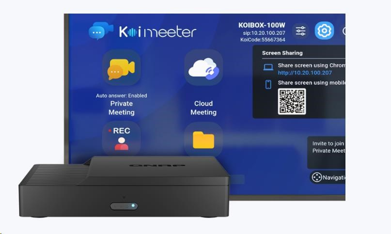 Zarízení KoiBox-100W s operačným systémom pre videokonferencie KoiMeeter je ideálnou náhradou nákladných konferenčných systémov založených na protokole SIP a ponúka pridanú hodnotu v podobe bezdrôtovej projekcie 4K, štvorpoločnej komunikácie a funkcií lokálneho úložiska. Pri súkromných stretnutiach pomocou zariadenia KoiBox-100W je zabezpečená vyššia bezpečnosť a súkromie v porovnaní so stretnutiami cez verejné cloudové služby a funkcia automatického prijímania poskytuje v určitých prostrediach väčšie pohodlie. Okrem súkromných stretnutí zefektívňuje zariadenie KoiBox-100W komunikáciu medzi rôznymi platformami tým, že umožňuje pripojenie k hovorom Zoom®, Skype™, Microsoft Teams®, Cisco Webex® a Google Meet™.