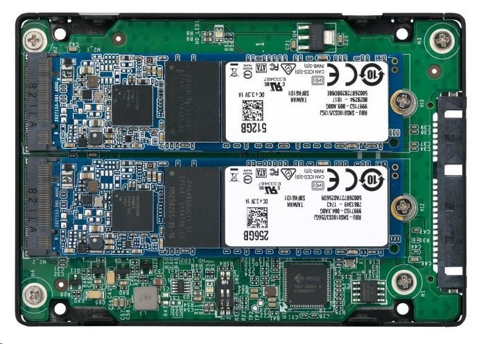 Použite dva M.2 SATA SSD moduly v jednej pozícii 2,5” pre diskové jednotky SATA s podporou RAID pre počítače a NAS