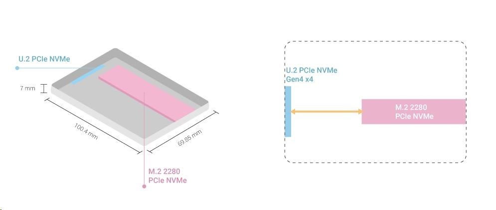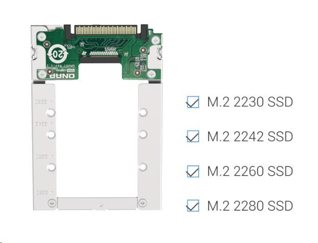 Ľahký QDA-UMP4A umožňuje inštalovať M.2 PCIe NVMe SSD do 2,5” slotu pre U.2 (SFF-8639) PCIe NVMe SSD zariadenie QNAP NAS. (M.2 SSD je predávané samostatne)