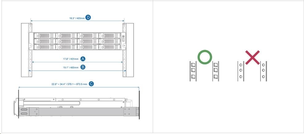 - Vzdialenosť medzi dvoma rackovými stĺpmi (meranie štvorcových otvorov racku stred-stred) je 18,3" (465 mm)