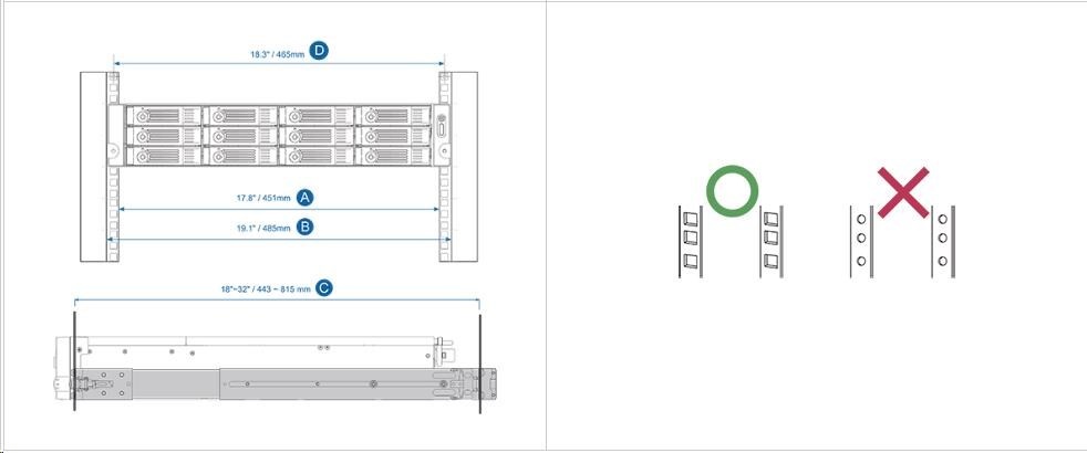 • Vzdialenosť medzi dvoma rackovými stĺpmi (meranie štvorcových otvorov racku stred-stred) je 18,3"(465 mm)