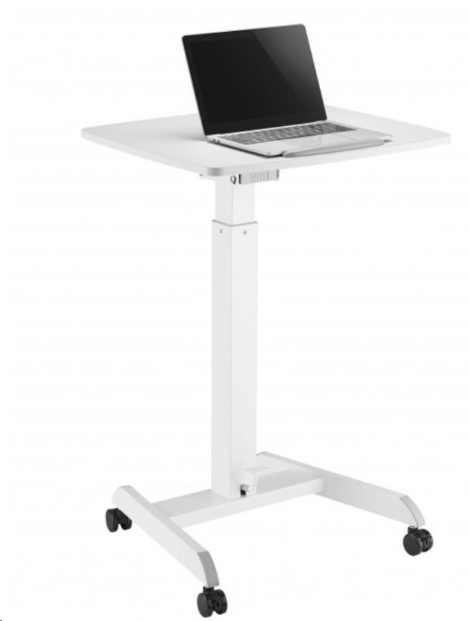 ERGononomický pracovný stolík na notebook alebo projektor max 8kg s mechanizmom ovládaným nohami so vzduchovým piestom na zmenu výšky 76-113cm, náklon pracovnej plochy 60x52cm 0-30°, vhodný na sedenie aj státie alebo ako lektorský stolík, rozmery 60x53x76-113cm, farba biela.