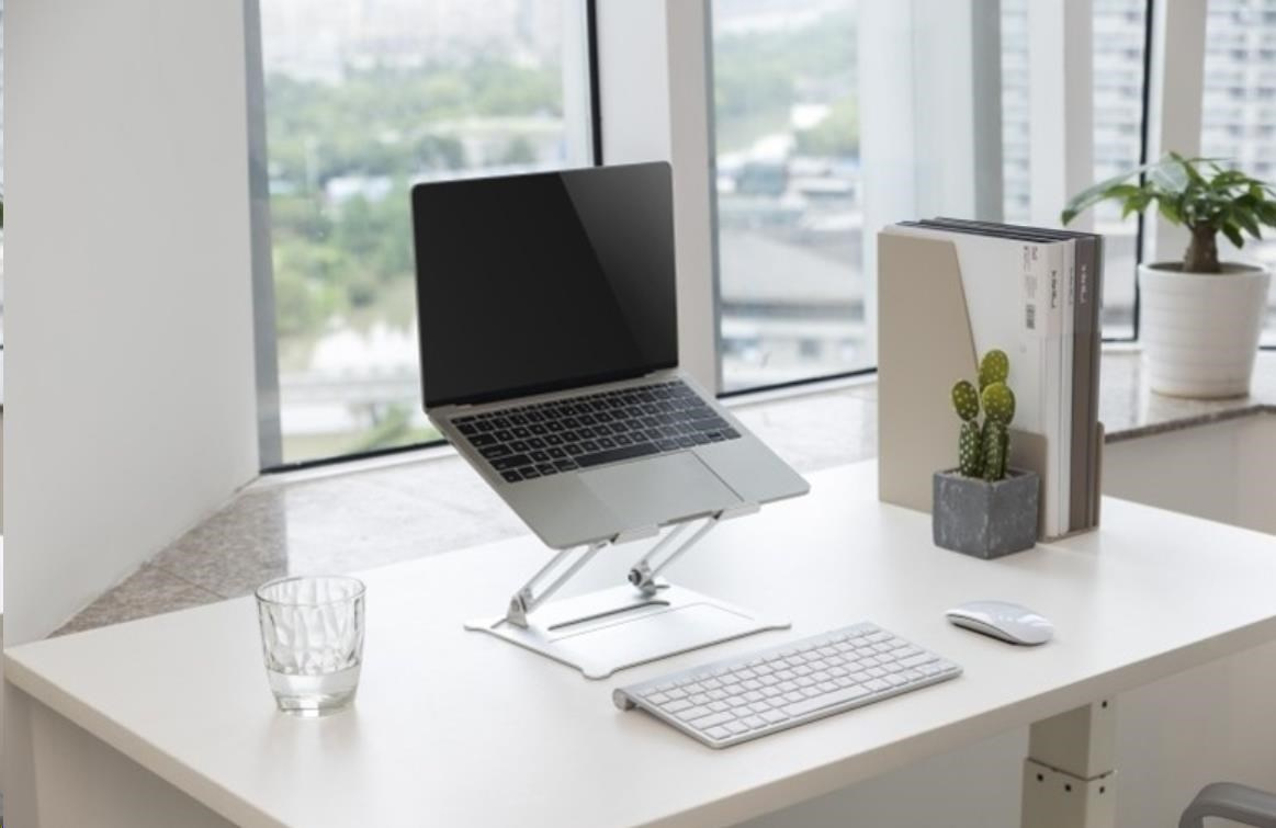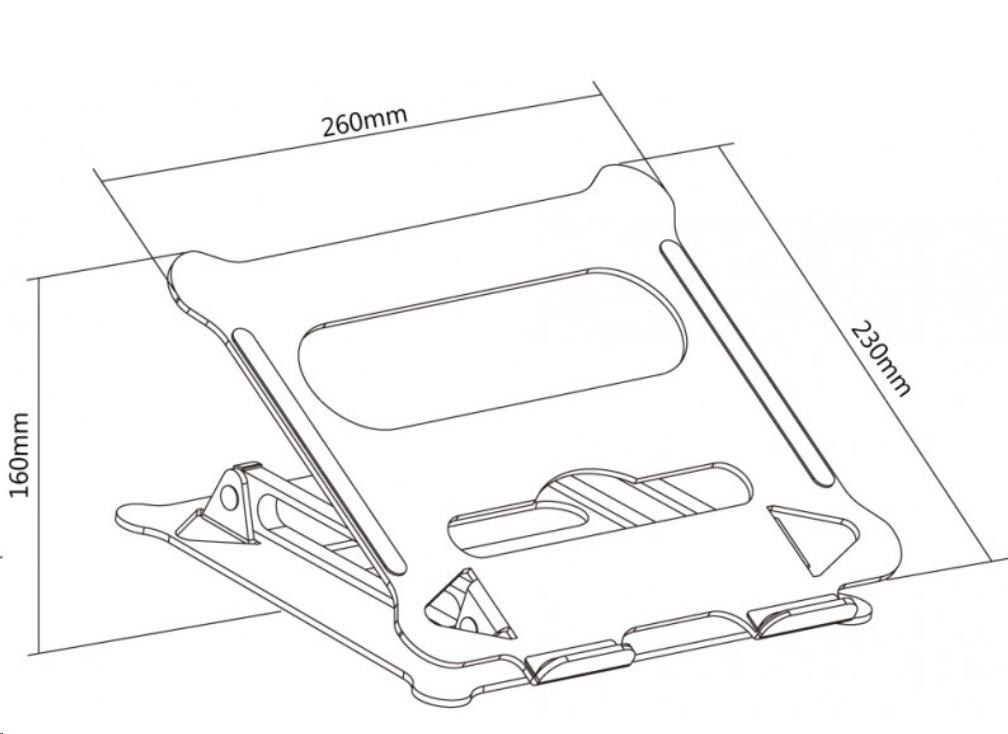 ERGOnomický hliníkový stojan na laptopy alebo tablety max 5kg pre dosiahnutie optimálneho nastavenia náklonu a výšky 11-15" monitora, prenosné prevedenie na stôl s protisklzovými plochami a otvory pre ventiláciu, pre použitie externé klávesnice, rozmery 26x23x16 cm, farba strieborná.
